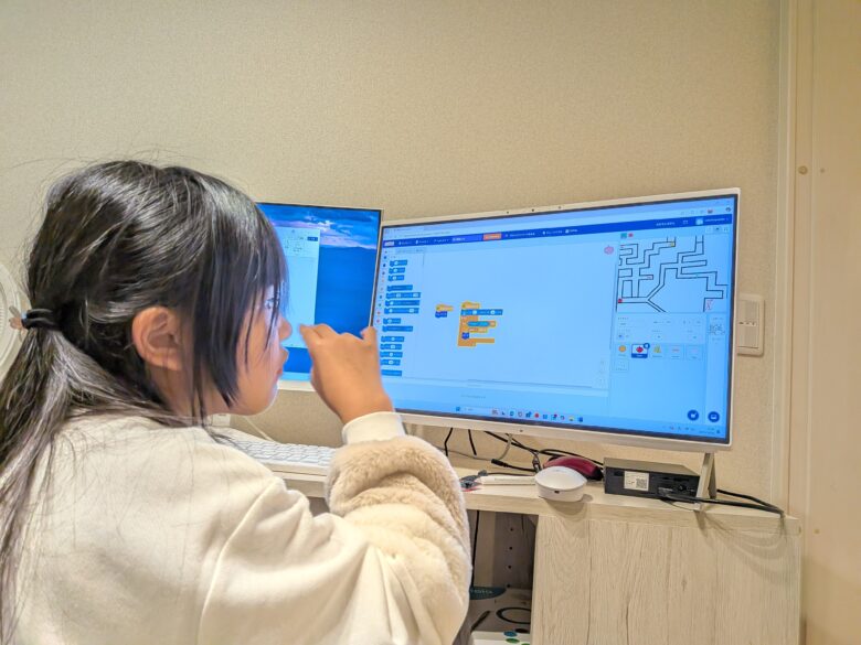 スクラッチは、前回の続きでマイクラビットを使用した迷路作成を行っています。迷路をマイクロビットを使ってスプライトが動けるようにプログラミングした後、自分なりに迷路のゲーム内容を考えてもらいました!かなほちゃんは、迷路のところどころにアイテムを設置して、そのアイテムに触れると何かアクションが起こるようプログラミングを頑張っています。また次回も続きを行っていきます。