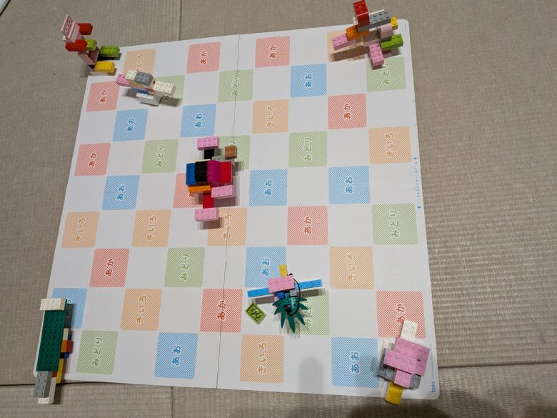 ロボットプログラミングは、小さなロボットにレゴで武器を取り付けてプログラミグをして動かし、ボード上にいる4体のレゴで作った敵を倒します。ボード上の枠は「行」「列」で番号が振り分けれており、それを考えながら自分が行きたい地点までプログラミングを行っていきます。最初それを理解するのが難しかったようですが、ふたりとも頑張ってプログラミングをして2体倒す事が出来ましたよ!!