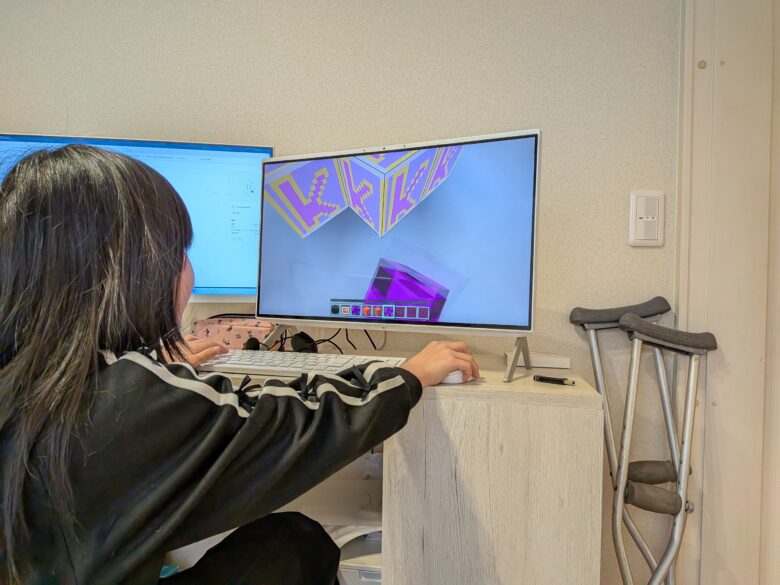 マインクラフトは、今年はブロックから自分で作成してもらい、そのブロックを使って乗り物を作るコンテストを行う予定です。かなほちゃんはさっそくブロック作成を開始しています。次回も続きを行っていきます。